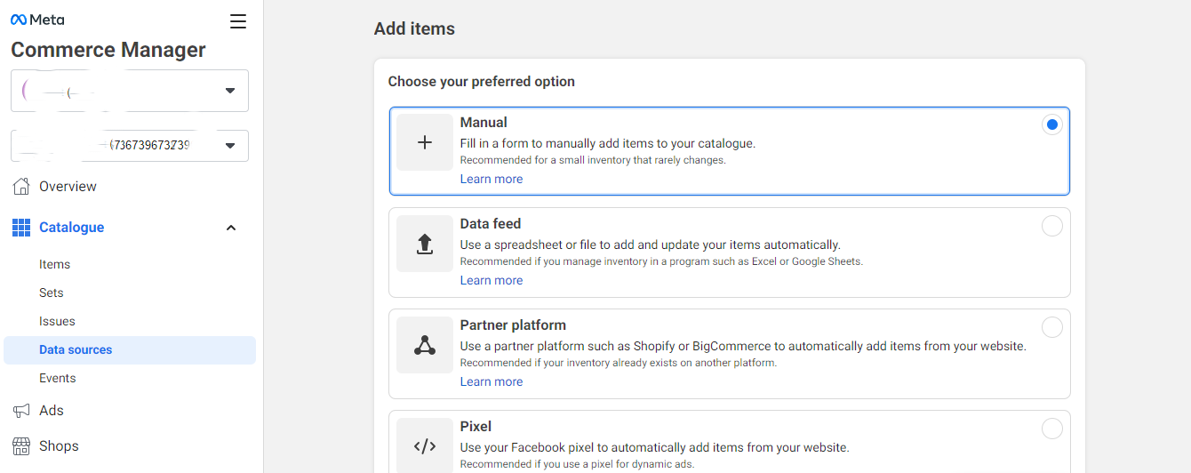 - Choose the upload method (Upload Product Info or Connect a partner platform). For now, select the Upload Product Info.